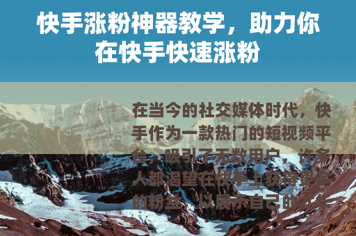 在当今的社交媒体时代,快手作为一款热门的短视频平台,吸引了无数用户,许多人都渴望在快手上获得更多的粉丝,以展示自己的才华、分享生活点滴或推广自己的产品与服务,就为大家带来一份快手涨粉神器教学,帮助你在快手的成长之路上更上一层楼。
