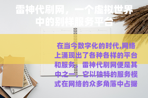 在当今数字化的时代,网络上涌现出了各种各样的平台和服务,雷神代刷网便是其中之一,它以独特的服务模式在网络的众多角落中占据了一席之地,为众多用户提供了一些别样的体验。