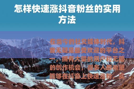 在当今的社交媒体时代,抖音无疑是最受欢迎的平台之一,拥有大量的用户和无限的创作机会,很多人都希望能够在抖音上快速涨粉,实现自己的影响力和价值,以下是一些可以帮助你快速涨抖音粉丝的有效方法。