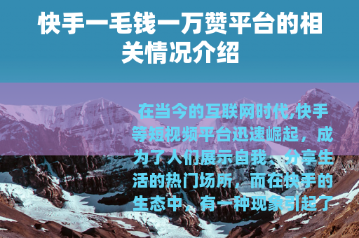 在当今的互联网时代,快手等短视频平台迅速崛起,成为了人们展示自我、分享生活的热门场所,而在快手的生态中,有一种现象引起了不少人的关注,那就是所谓的快手一毛钱一万赞平台。
