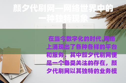 在当今数字化的时代,网络上涌现出了各种各样的平台和服务,其中颜夕代刷网便是一个备受关注的存在,颜夕代刷网以其独特的业务模式,在网络的某个角落里悄然发展着。