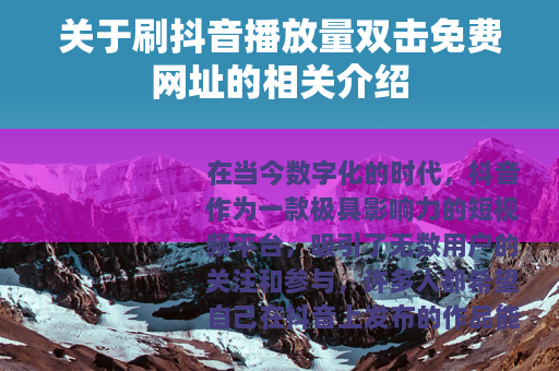 在当今数字化的时代,抖音作为一款极具影响力的短视频平台,吸引了无数用户的关注和参与,许多人都希望自己在抖音上发布的作品能够获得更多的播放量和双击点赞,从而提升自己的影响力和知名度,而网络上也出现了一些声称可以提供刷抖音播放量双击免费网址的信息。