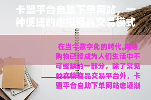 在当今数字化的时代,网络购物已经成为人们生活中不可或缺的一部分,除了常见的实物商品交易平台外,卡盟平台自助下单网站也逐渐崭露头角,为用户提供了一种全新的虚拟商品交易体验。