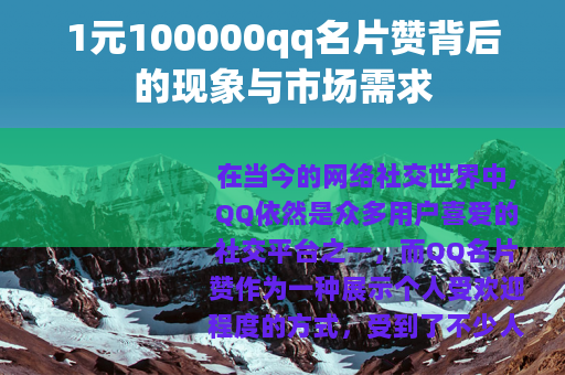 1元100000qq名片赞作为网络社交中的一个独特现象,它的出现和发展是多种因素共同作用的结果,我们应该以客观、理性的态度去认识它,在满足自身社交需求的同时,也要注重社交的本质和意义,让网络社交更加健康、有序地发展。
