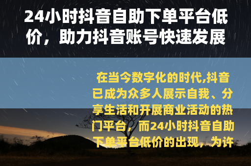 在当今数字化的时代,抖音已成为众多人展示自我、分享生活和开展商业活动的热门平台,而24小时抖音自助下单平台低价的出现,为许多抖音用户提供了一种新的助力方式。