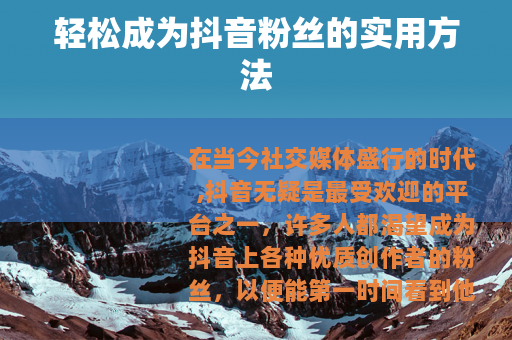 在当今社交媒体盛行的时代,抖音无疑是最受欢迎的平台之一,许多人都渴望成为抖音上各种优质创作者的粉丝,以便能第一时间看到他们精彩的内容,怎样才能成为抖音的粉丝呢?
