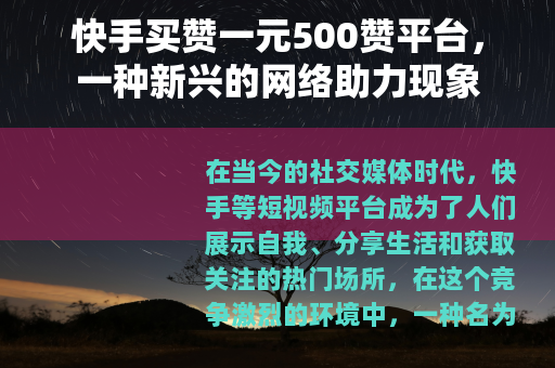 在当今的社交媒体时代,快手等短视频平台成为了人们展示自我、分享生活和获取关注的热门场所,在这个竞争激烈的环境中,一种名为“快手买赞一元500赞平台”的服务悄然兴起,吸引了众多用户的目光。
