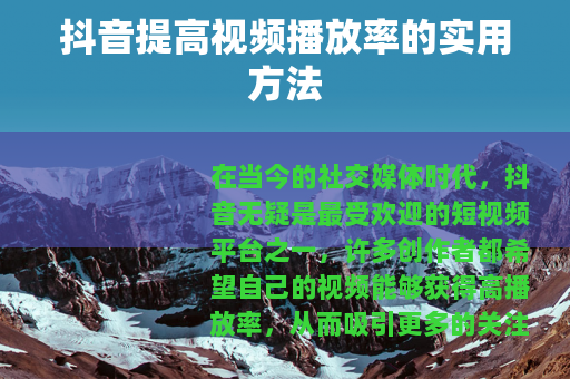 在当今的社交媒体时代,抖音无疑是最受欢迎的短视频平台之一,许多创作者都希望自己的视频能够获得高播放率,从而吸引更多的关注和粉丝,抖音如何提高一条视频的播放率呢?以下是一些实用的方法。 是关键,要确保你的视频内容具有吸引力和独特性,可以从热门话题入手,结合自己的特长和风格,创造出与众不同的视频内容,如果你擅长烹饪,那么可以制作一些新颖的美食制作视频,或者分享一些独特的烹饪技巧,要注意视频的趣味性和实用性,让观众在观看视频的过程中既能获得乐趣,又能学到知识或得到某种启发。