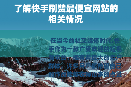在当今的社交媒体时代,快手作为一款广受欢迎的短视频平台,拥有着庞大的用户群体,许多用户都希望自己的作品能够获得更多的点赞,从而提高曝光度和影响力,在这样的需求下,一些所谓的快手刷赞最便宜网站应运而生。
