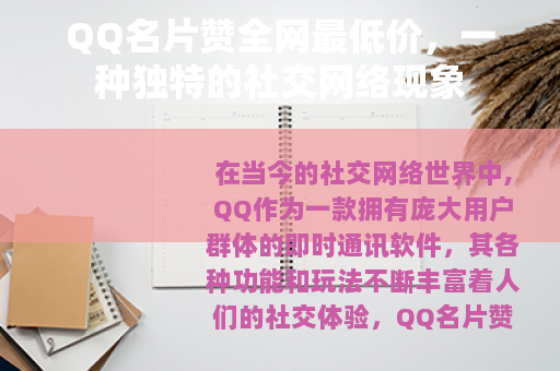 在当今的社交网络世界中,QQ作为一款拥有庞大用户群体的即时通讯软件,其各种功能和玩法不断丰富着人们的社交体验,QQ名片赞成为了许多用户关注的一个热点,而全网最低价的QQ名片赞更是吸引了众多人的目光。
