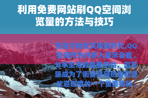 通过免费网站刷QQ空间浏览量是一种可以尝试的方法,但要注意选择合适的网站,掌握正确的技巧,并且保持理性和正确的心态,也要不断努力提升自己空间的内容质量和互动性,这样才能让自己的QQ空间真正获得更多的关注和喜爱,成为自己在网络世界中展示自我、结交朋友的理想平台,在这个过程中,我们要充分享受社交网络带来的乐趣,用积极的方式去经营和发展自己的QQ空间,让它为我们的生活增添更多的色彩和意义。