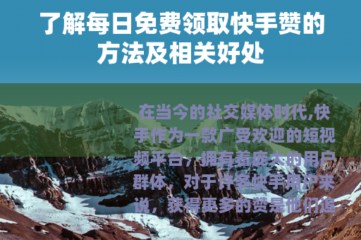 在当今的社交媒体时代,快手作为一款广受欢迎的短视频平台,拥有着庞大的用户群体,对于许多快手用户来说,获得更多的赞是他们追求的目标之一,因为赞不仅代表着作品的受欢迎程度,还能在一定程度上提升账号的活跃度和影响力,而每日免费领取快手赞这一方式,也逐渐受到了不少人的关注。