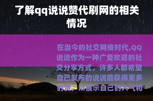 在当今的社交网络时代,QQ说说作为一种广受欢迎的社交分享方式,许多人都希望自己发布的说说能获得更多的赞,以展示自己的人气和魅力,qq说说赞代刷网应运而生。