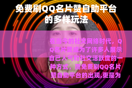 在当今的社交网络时代,QQ名片赞成为了许多人展示自己人气和社交活跃度的一种方式,而免费刷QQ名片赞自助平台的出现,更是为广大QQ用户提供了一种独特的体验。
