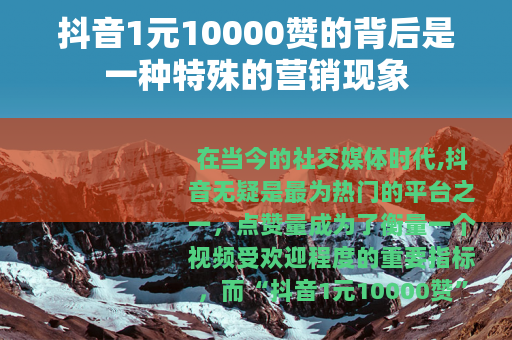 在当今的社交媒体时代,抖音无疑是最为热门的平台之一,点赞量成为了衡量一个视频受欢迎程度的重要指标,而“抖音1元10000赞”这样的现象也随之出现,引发了众多用户的关注。