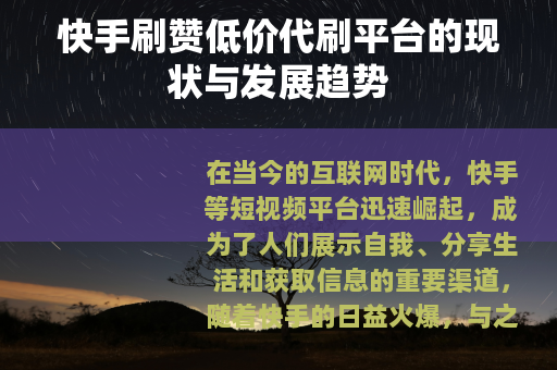 在当今的互联网时代,快手等短视频平台迅速崛起,成为了人们展示自我、分享生活和获取信息的重要渠道,随着快手的日益火爆,与之相关的产业也不断涌现,其中快手刷赞低价代刷平台就是一个备受关注的领域。