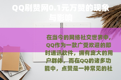 在当今的网络社交世界中,QQ作为一款广受欢迎的即时通讯软件,拥有庞大的用户群体,而在QQ的诸多功能中,点赞是一种常见的社交互动方式,它可以表达用户对他人动态的喜爱和支持,近年来,一种名为“QQ刷赞网0.1元万赞”的现象逐渐兴起,引起了不少人的关注。