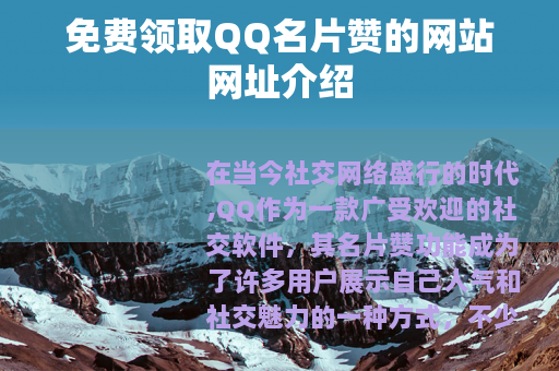 免费领取QQ名片赞的网站网址为广大QQ用户提供了一个增加名片赞数量的便捷途径,通过这些网站,用户可以在不花费太多精力和金钱的情况下,让自己的QQ名片更加出彩,吸引更多好友的关注和点赞,只要用户能够正确选择和合理使用这些网站,就能够在QQ社交世界中展现出自己独特的魅力,享受更加丰富的社交体验。