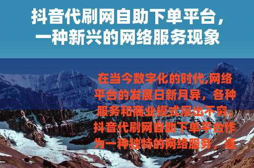 在当今数字化的时代,网络平台的发展日新月异,各种服务和商业模式层出不穷,抖音代刷网自助下单平台作为一种独特的网络服务,逐渐进入了大众的视野。