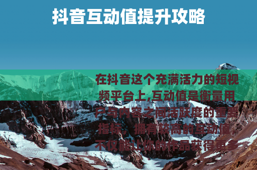 在抖音这个充满活力的短视频平台上,互动值是衡量用户与内容之间活跃度的重要指标,拥有较高的互动值,不仅能让你的作品获得更多的曝光机会,还能增强你与粉丝之间的粘性,进一步扩大你的影响力,抖音互动值怎么提高呢?下面就为大家详细介绍一些实用的方法。