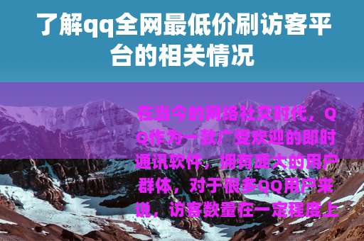 在当今的网络社交时代,QQ作为一款广受欢迎的即时通讯软件,拥有庞大的用户群体,对于很多QQ用户来说,访客数量在一定程度上代表着自己的社交活跃度和受欢迎程度,市场上出现了各种各样的刷访客平台,其中qq全网最低价刷访客平台备受关注。