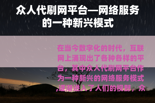 在当今数字化的时代,互联网上涌现出了各种各样的平台,其中众人代刷网平台作为一种新兴的网络服务模式,逐渐进入了人们的视野。