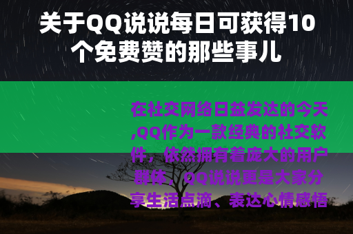 在社交网络日益发达的今天,QQ作为一款经典的社交软件,依然拥有着庞大的用户群体,QQ说说更是大家分享生活点滴、表达心情感悟的重要平台,而对于很多用户来说,自己发布的说说能获得更多的赞,无疑是一件令人开心的事情,我们就来聊一聊QQ说说每日10个免费赞的相关情况。