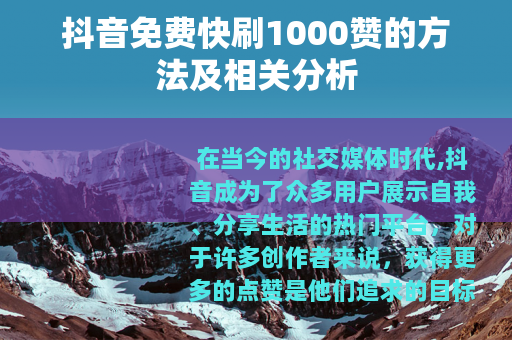 在当今的社交媒体时代,抖音成为了众多用户展示自我、分享生活的热门平台,对于许多创作者来说,获得更多的点赞是他们追求的目标之一,因为点赞数量在一定程度上代表了作品的受欢迎程度和影响力,而抖音免费快刷1000赞也成为了一个备受关注的话题。