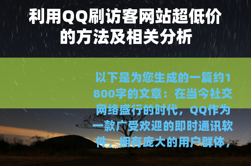 QQ刷访客网站超低价的现象是一个复杂的社会和网络现象,它涉及到用户心理、市场竞争、平台监管、社交生态等多个方面,我们需要从多个角度去认识和理解它,以便在社交网络的发展过程中,能够更好地引导和规范这种行为,促进社交网络的健康、有序发展,让社交网络真正成为人们交流、分享、成长的有益平台。 能满足您的需求,您可以根据实际情况进行调整和修改,需要注意的是,通过非正规手段刷访客等行为可能违反相关法律法规和平台规定,实际应用中请确保遵守法律法规和道德规范。