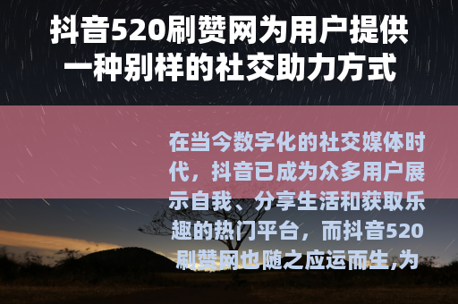 在当今数字化的社交媒体时代,抖音已成为众多用户展示自我、分享生活和获取乐趣的热门平台,而抖音520刷赞网也随之应运而生,为广大抖音用户带来了一种新的体验。