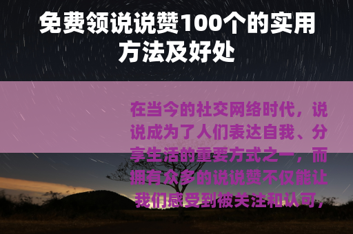 在当今的社交网络时代,说说成为了人们表达自我、分享生活的重要方式之一,而拥有众多的说说赞不仅能让我们感受到被关注和认可,还能在一定程度上提升我们在社交平台上的影响力,就来和大家分享一下免费领说说赞100个的一些途径和方法,以及它所带来的积极意义。
