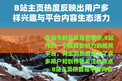 在当今的互联网世界中,B站作为一个极具影响力的视频平台,其主页热度成为了众多用户和创作者关注的焦点,B站主页热度是平台内容受欢迎程度的直观体现,它蕴含着丰富的信息,反映出用户多样的兴趣以及平台内容生态的活力。