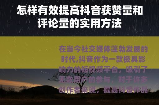 在当今社交媒体蓬勃发展的时代,抖音作为一款极具影响力的短视频平台,吸引了无数用户的参与,对于许多创作者来说,提高抖音作品的获赞量和评论量是他们不断追求的目标,怎样才能实现这一目标呢?以下是一些实用的方法。 质量是关键,要确保你的视频内容具有独特性和吸引力,可以从自身的兴趣爱好、专业技能或生活中的有趣经历出发,创作一些能够引起观众共鸣的视频,如果你擅长烹饪,那么可以制作一系列精美的美食制作视频,详细展示烹饪过程和独特的配方,让观众在观看后不仅能够学到新知识,还能感受到美食的魅力,从而更愿意点赞和评论。