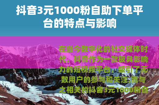 在当今数字化的社交媒体时代,抖音作为一款极具影响力的短视频平台,吸引了无数用户的参与和关注,而与之相关的抖音3元1000粉自助下单平台也逐渐进入了人们的视野。