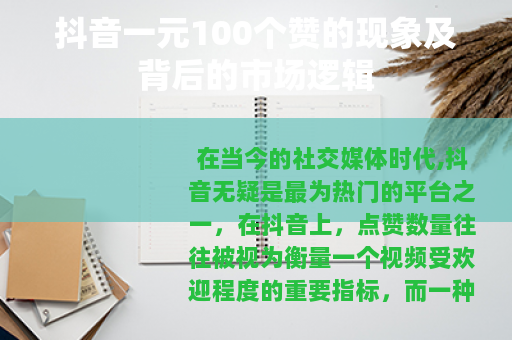 在当今的社交媒体时代,抖音无疑是最为热门的平台之一,在抖音上,点赞数量往往被视为衡量一个视频受欢迎程度的重要指标,而一种“抖音一元100个赞”的现象也随之悄然兴起。