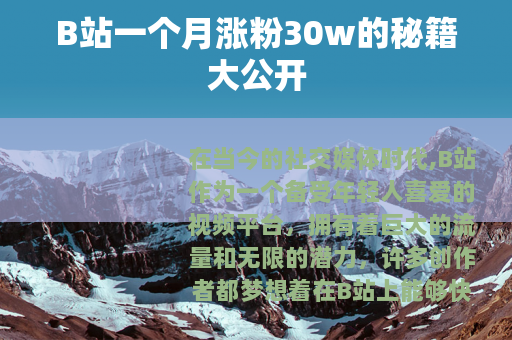 在当今的社交媒体时代,B站作为一个备受年轻人喜爱的视频平台,拥有着巨大的流量和无限的潜力,许多创作者都梦想着在B站上能够快速涨粉,实现自己的创作价值和影响力,我们就来一起探讨一下如何在B站一个月涨粉30w的方法。 创作是关键,要想吸引大量的粉丝,就必须提供高质量、有特色、有趣味的视频内容,这需要创作者深入了解自己的目标受众,明确他们的兴趣点和需求,然后根据这些来制定创作方向,如果你的目标受众是游戏爱好者,那么你可以制作精彩的游戏攻略、搞笑的游戏直播剪辑或者深度的游戏评测等视频,通过提供有价值的内容,让观众在观看你的视频后能够有所收获,从而增加他们对你的关注和喜爱。
