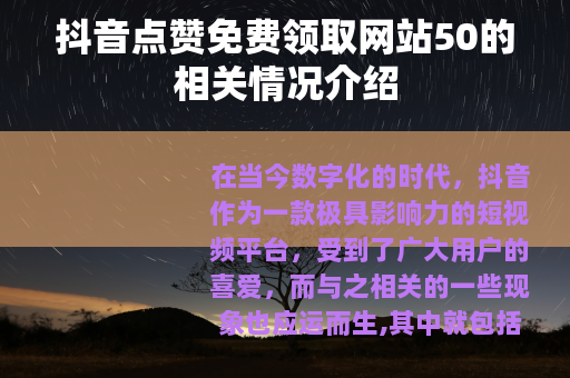 在当今数字化的时代,抖音作为一款极具影响力的短视频平台,受到了广大用户的喜爱,而与之相关的一些现象也应运而生,其中就包括抖音点赞免费领取网站50这样的情况。