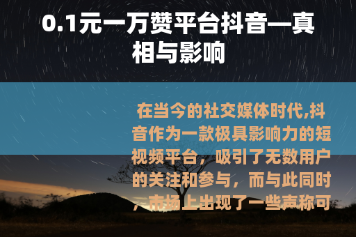 在当今的社交媒体时代,抖音作为一款极具影响力的短视频平台,吸引了无数用户的关注和参与,而与此同时,市场上出现了一些声称可以提供0.1元一万赞的平台,这一现象引发了众多讨论。