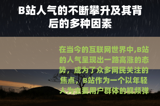 B站人气的不断攀升是多种因素共同作用的结果,其丰富多元的内容生态、独特的社区氛围、活跃的创作者生态、不断创新的技术以及成功的品牌建设和市场推广,都使得B站在激烈的互联网竞争中脱颖而出,成为了一个备受瞩目的互联网平台,随着时代的发展和用户需求的不断变化,相信B站将继续保持其创新精神,不断完善和发展自己,为用户带来更多的惊喜和价值,其人气也将在未来持续高涨,在互联网的舞台上绽放出更加耀眼的光芒。