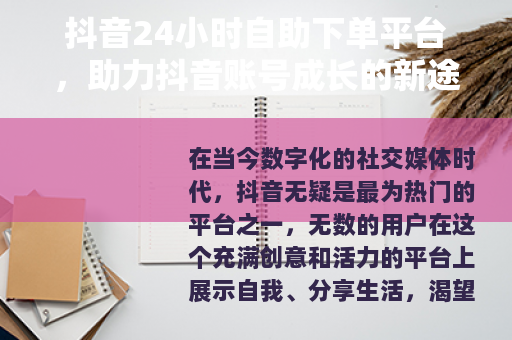 在当今数字化的社交媒体时代,抖音无疑是最为热门的平台之一,无数的用户在这个充满创意和活力的平台上展示自我、分享生活,渴望获得更多的关注和点赞,而抖音24小时自助下单平台的出现,为广大抖音用户提供了一种全新的助力方式。