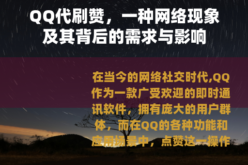 在当今的网络社交时代,QQ作为一款广受欢迎的即时通讯软件,拥有庞大的用户群体,而在QQ的各种功能和应用场景中,点赞这一操作逐渐成为了用户表达喜爱、认可或支持的一种常见方式,QQ代刷赞的现象应运而生,成为了一个值得关注和探讨的话题。