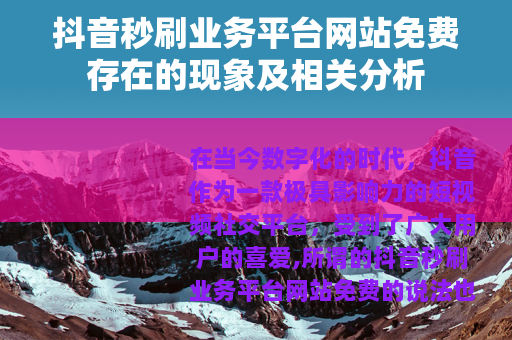 在当今数字化的时代,抖音作为一款极具影响力的短视频社交平台,受到了广大用户的喜爱,所谓的抖音秒刷业务平台网站免费的说法也在网络上悄然兴起。