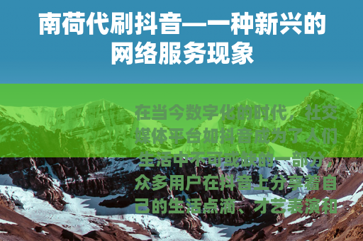 在当今数字化的时代,社交媒体平台如抖音成为了人们生活中不可或缺的一部分,众多用户在抖音上分享着自己的生活点滴、才艺表演和各种创意内容,抖音也因此汇聚了庞大的用户群体和海量的信息流量,而在这个过程中,一种名为南荷代刷抖音的服务逐渐走进了人们的视野。