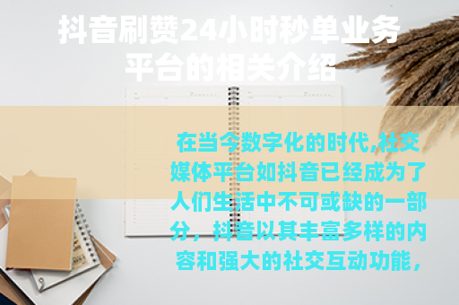 在当今数字化的时代,社交媒体平台如抖音已经成为了人们生活中不可或缺的一部分,抖音以其丰富多样的内容和强大的社交互动功能,吸引了数以亿计的用户,而在抖音的生态中,点赞数往往被视为衡量一个视频受欢迎程度的重要指标之一,一些所谓的抖音刷赞24小时秒单业务平台应运而生。