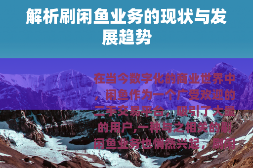 在当今数字化的商业世界中,闲鱼作为一个广受欢迎的二手交易平台,吸引了大量的用户,一种与之相关的刷闲鱼业务也悄然兴起。