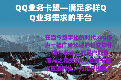 在当今数字化的时代,QQ作为一款广受欢迎的社交软件,拥有着庞大的用户群体,而与之相关的QQ业务卡盟也应运而生,为用户提供了丰富多样的服务。
