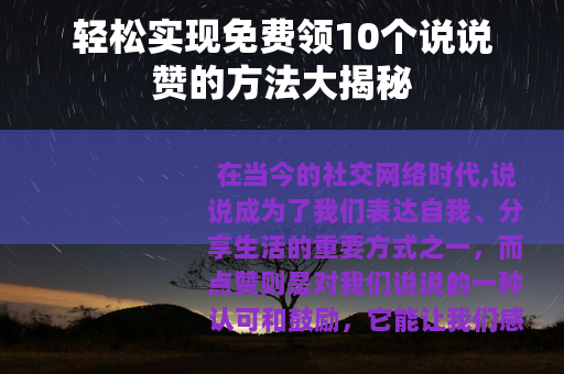 想要免费领10个说说赞并不是一件难事,只要我们善于利用各种资源,积极参与社交互动,优化自己的说说内容,就一定能够实现这个小目标,让我们的说说在社交网络中获得更多的关注和喜爱,展现出我们独特的魅力和个性。 对您有所帮助,您可以根据实际需求对文章进行调整和修改,如果您还有其他问题,欢迎继续向我提问。