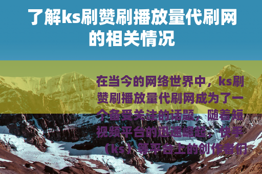 在当今的网络世界中,ks刷赞刷播放量代刷网成为了一个备受关注的话题,随着短视频平台的迅速崛起,快手(ks)等平台上的创作者们都希望自己的作品能够获得更多的关注和流量,而刷赞和刷播放量的代刷网便应运而生。