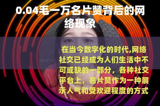 0.04毛一万名片赞的现象在网络社交中是一个复杂而又值得关注的问题,它既反映了用户对社交影响力的追求和市场的需求,同时也带来了一系列关于社交真实性、营销道德和平台管理等方面的挑战,只有通过用户、社交平台和社会各方的共同努力,才能营造一个健康、真实、有价值的网络社交环境,让名片赞真正成为用户之间真诚互动和认可的象征,而不是虚假繁荣的工具,在未来的发展中,我们需要在追求社交影响力和保持社交真实性之间找到一个平衡,让网络社交能够更好地服务于人们的生活和社会的发展。