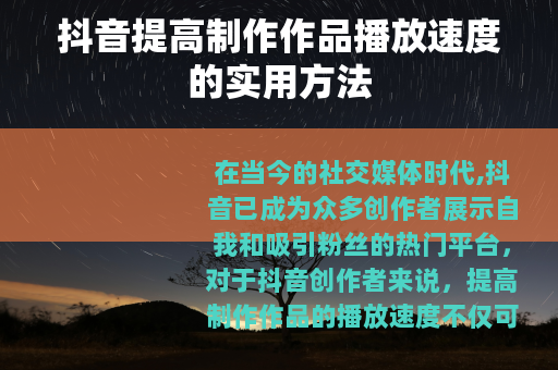 在当今的社交媒体时代,抖音已成为众多创作者展示自我和吸引粉丝的热门平台,对于抖音创作者来说,提高制作作品的播放速度不仅可以提高创作效率,还能让自己的作品更及时地呈现在观众面前,从而获得更多的关注和流量,以下是一些关于抖音如何提高制作作品播放速度的有效方法。